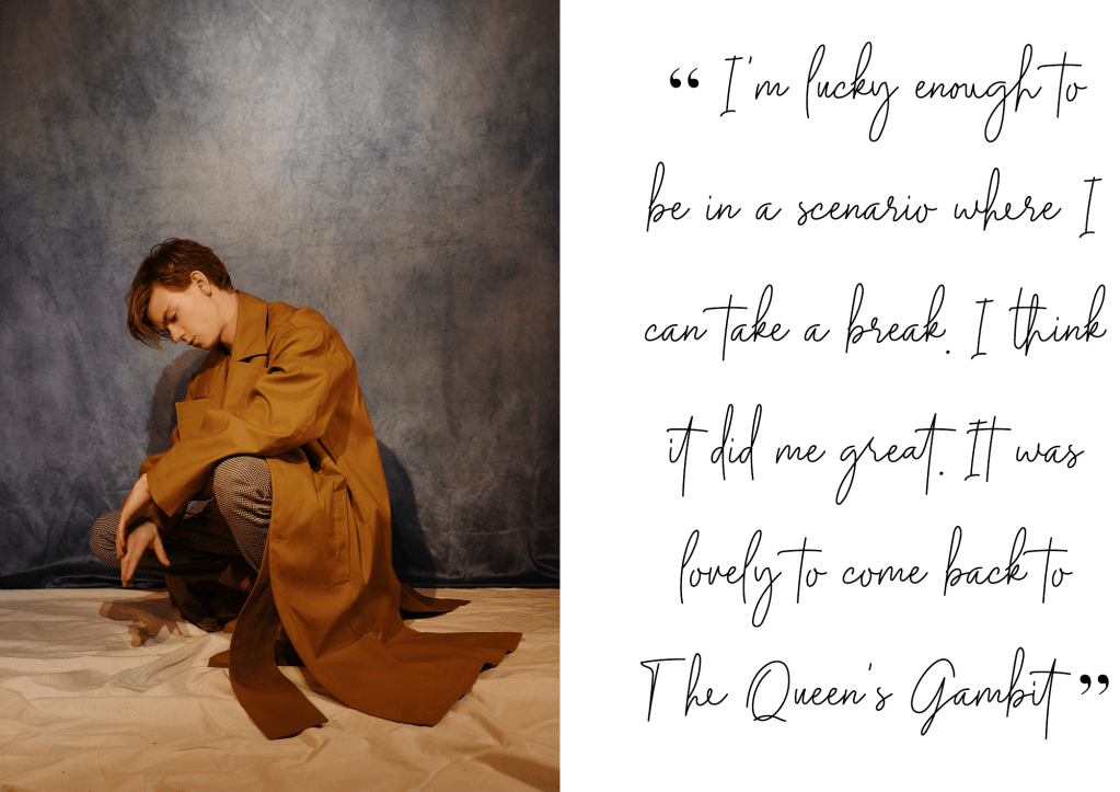 While the central topic of The Queen’s Gambit is a chess competition, the series extends to far more than simply chess with its flirtation with madness vs greatness. “I think it’s important to reach your goals and push yourself as hard as you can, while also holding onto the things that make life enjoyable. When success happens, you have the pressure of other people pushing you to receive that same level of success. The more success you get, the more you become fixated on this one thing, and the further you can get away from enjoyment.”