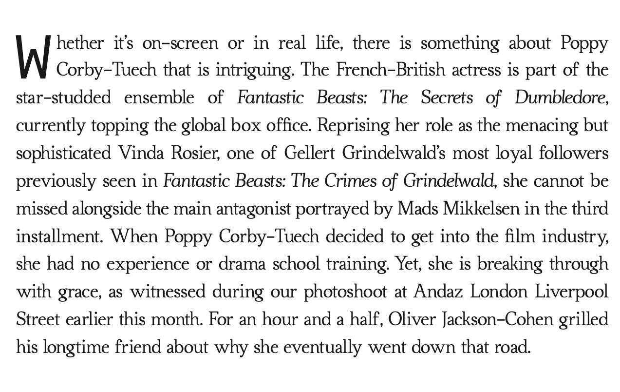 During a call between London and Marseille, Poppy Corby-Tuech sat down with actor Oliver Jackson-Cohen, a “fellow half-Frenchie” with whom she has a lot in common, to dive into her diverse careers before acting, compare French childhood references, and unveil some facts behind the making of Fantastic Beasts.