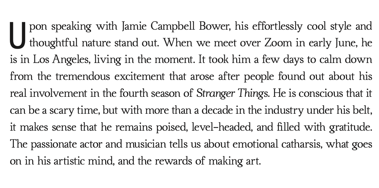 It was one of a kind acting experience for Jamie who had to dive deep into several complex personalities, but he went from angelic to demonic seamlessly. However, to get into character, he explains the extent to which he had to get lost. “As you beautifully put it, getting lost is exactly what was necessary [because] when I lose the idea of self-control, this real, beautiful exposure comes. There were things that would pop up that came from the experience of this person, and that was always quite odd. I’m reticent to say what they are because obviously, the character is not doing particularly kind things. But I can still remember the feeling and it was a very interesting space to be in.” With the emotional depth he emitted in Henry Creel, 001, or Vecna’s scenes, it is not surprising to learn that after “Cut!” was called, the actor needed five minutes to sit down, have a cigarette, and take a deep breath to step out of character. “Those moments were always very interesting and enlightening, but sometimes a bit scary. I needed to make sure that I was not talking to anybody else and impacting them in a negative way,” he says.