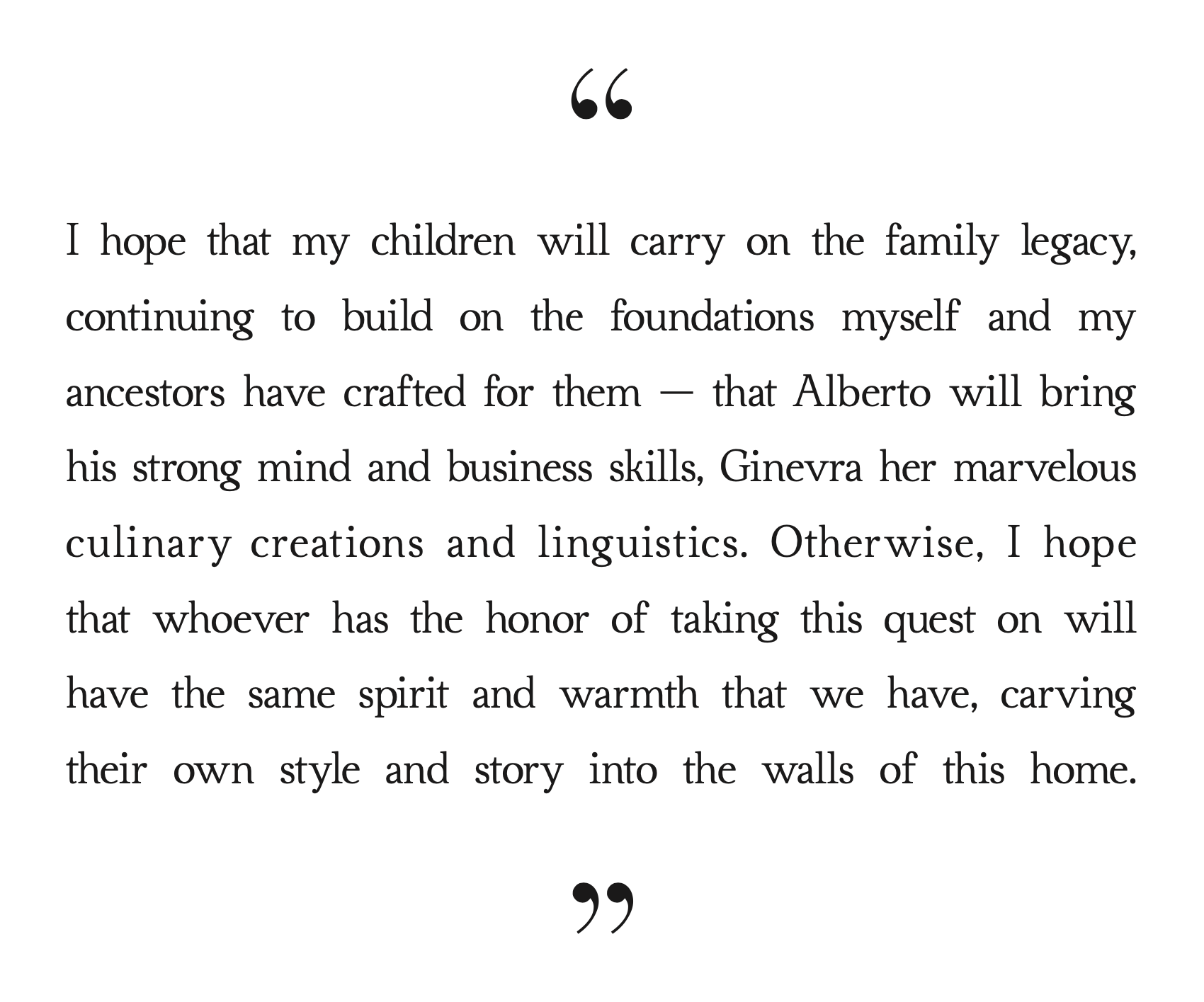 What sets Hotel Principe apart is the prevalent sense of family felt throughout the hotel, a value that is at the heart of the national culture. “The hotel is our home, it always has been. Ever since my parents fell in love, crossing paths for the first time on the road just outside our front doors, we have crafted the walls of this beautiful building into a home that welcomes people from all nations to stay as a family.” When you meet the team members, you feel that they are loyal, attentive, and passionate. To name them, “Hardip, Anna, Geraldine, Rodel, Jeffrey, Ferdinando, Sacha e Andrea, and Daisy [are considered to be] cousins, sisters, brothers, aunties and uncles.” As a guest, there is something comforting about running into the same familiar faces every day. Whenever you interact with them, you truly have the impression you’ve become part of their famiglia e casa.