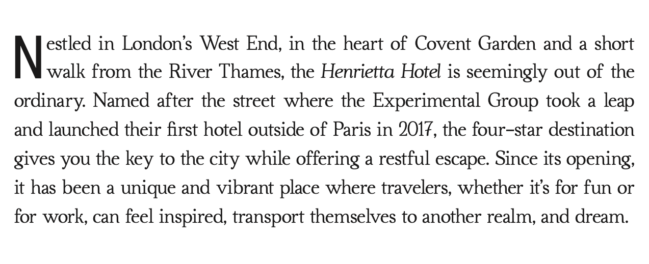 Step into the Henrietta Hotel, a picturesque location in Covent Garden that will make you feel like you landed in a Wes Anderson film. “Henrietta is truly a home away from home. Each detail is important and makes the experience of staying with us that much more special.”