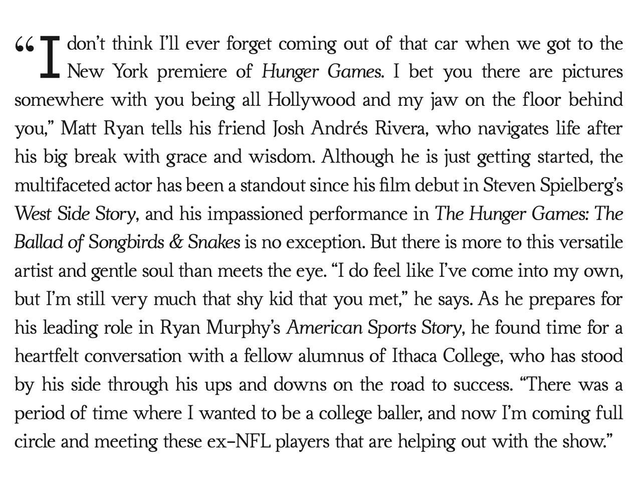 Fresh off a whirlwind global press tour, Josh Andrés Rivera gets help from his “buddy from college” Matt Ryan to make sense of this thrilling chapter.
