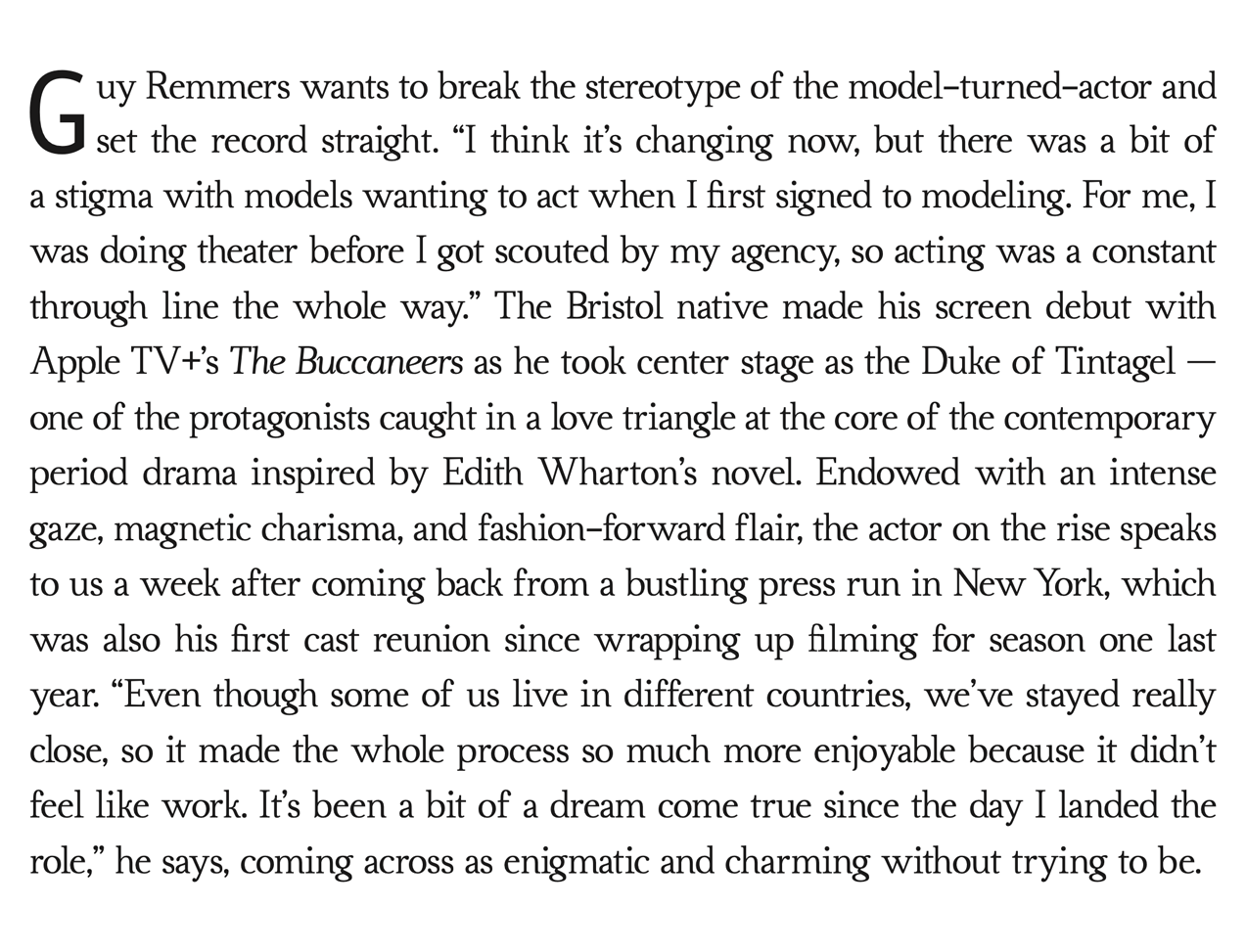 By the time he landed the role of the dashing Duke, the British actor had already spent “ten years of various in-person auditions and self-tapes” to forge the path leading to his big break. “I couldn’t give a number, but it would be well over 100,” he says. “I might have been 19 at the time that I was signed to an acting agent who came to watch a play I did at the National Theatre, and I think I landed the role of The Buccaneers when I was 27 — I’m now 28.” He recalls he found his love for acting and storytelling at secondary school. “I’m dyslexic and I did really badly academically at school, but I had an incredible teacher who had trained at LAMDA and pushed me to go to the drama class. I remember watching her do an impression of an old man and being completely amazed by this person who transformed themselves.” As a result, he joined an after-school acting course and eventually took the stages of some prestigious theaters between his hometown and London. “When I went to sixth form, I did an open audition for a play called The Grandfathers at the Bristol Old Vic. I got one of the main roles, so I did a lot of theater when I was from the ages of around 16 to 20-21. I was lucky to be in the right place at the right time.”