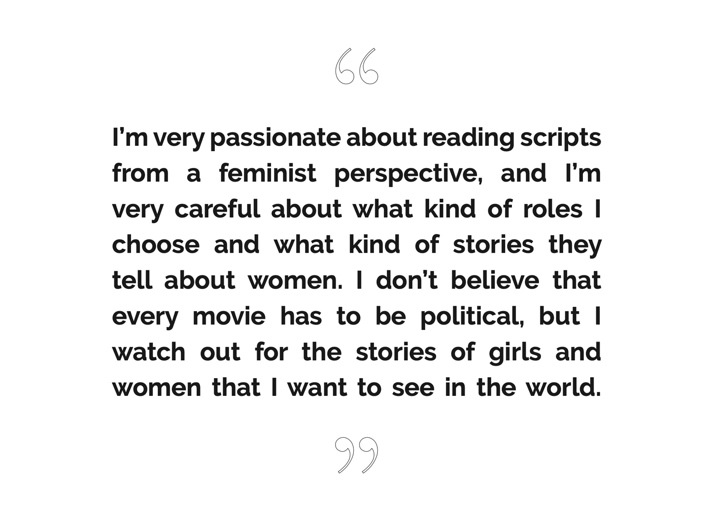 I’m very passionate about reading scripts from a feminist perspective, and I’m very careful about what kind of roles I choose and what kind of stories they tell about women. I don’t believe that every movie has to be political, but I watch out for the stories of girls and women that I want to see in the world. I feel like the awareness of what kind of female stories to tell is definitely changing and I try to make a difference myself by choosing characters that are everything. A woman can be messy, imperfect, strong, vulnerable, weak, funny, and powerful.