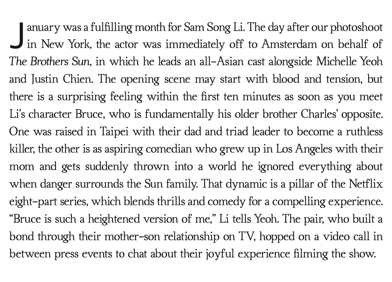 Following the release of The Brothers Sun, Sam Song Li talks to his iconic on-screen mother Michelle Yeoh about his most memorable moments and behind-the-scenes stories.