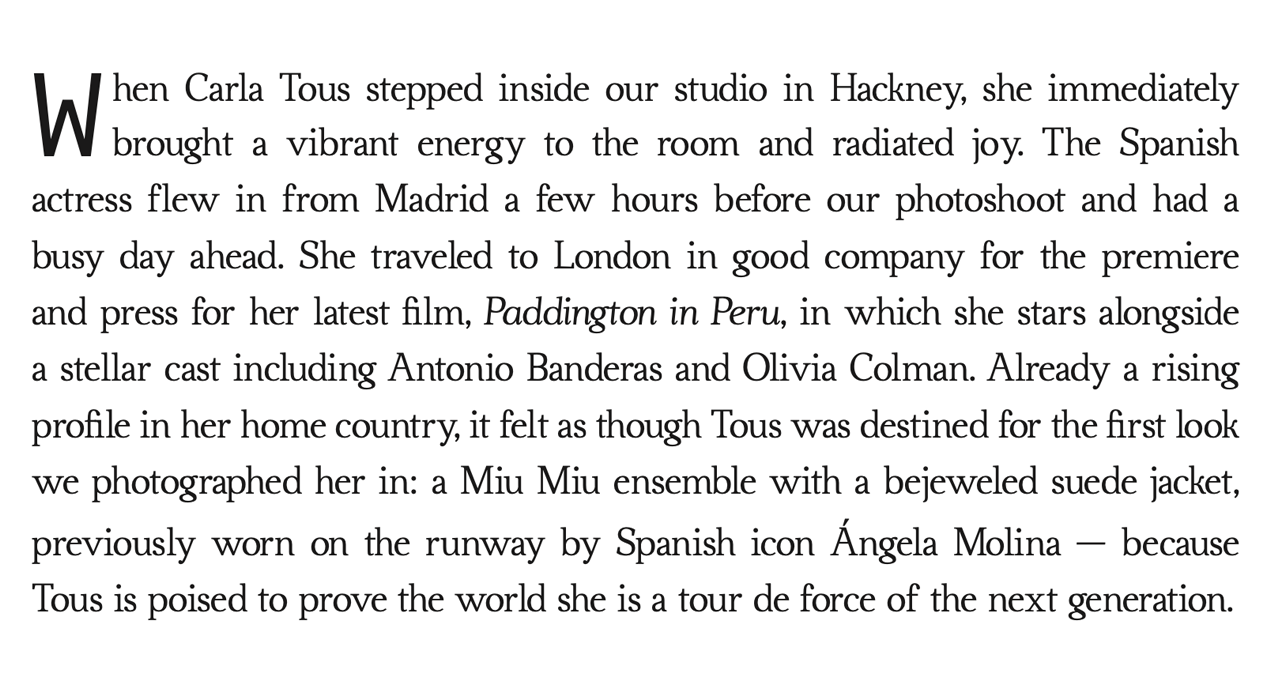 More importantly for Tous, she doesnโt want to be defined by just her work. โI hate to say: โIโm Carla and Iโm an actress.โ No โ Iโm Carla Tous and I act, but Iโm plenty of things: Iโm also a friend, a daughter, a cook, a dancerโฆ If I need to be remembered for something, itโs because of the way I am [which is why] I try to be respectful and kind.โ To wrap up, we talk about whatโs inside her dreams. โIโve never worked with a female director, so I would aim for that. And I also wish to be able to work with my friends on some type of work or art โ I have like 10 friends that are wonderful actors and actresses.โ But for now, Tous embraces her Paddington era to the fullest and it makes her eager for more. โI love working in Spain, I love the Spanish culture and the art that we do here, but I hope itโs not the last time I get to experience something like this. I donโt know if a year is realistic, but letโs maybe do another project outside Spain five years from now. [In the meantime], I will just keep working, doing the things that I love, and spending quality time with my loved ones.โ