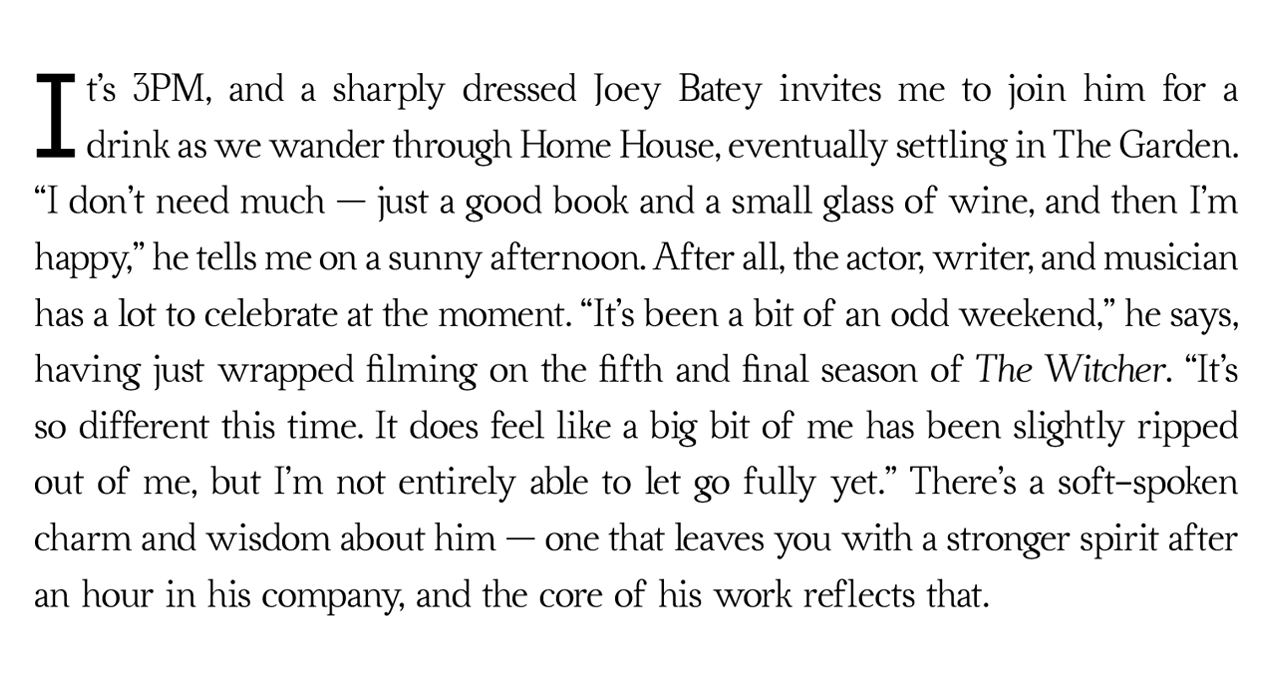 For now, his attention is on his book — and inevitably, on The Witcher. “I think people are going to be really pleasantly surprised,” he says about the last two seasons that got filmed back-to-back. The Netflix adaptation of Andrzej Sapkowski’s books has sparked a lot of mixed reactions since Liam Hemsworth was announced to replace Henry Cavill in the titular role. Nevertheless, Batey manages to keep the noise at bay and stays anchored in his values. “My job isn’t to anticipate, nor is it to judge. My job is to turn up and try to do the best job that I can, whilst helping and welcoming people back to the show, or into the show, and facilitating a kind of environment in which they can do their best work as well.”