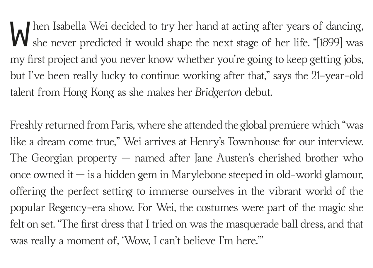 When she found out she’d landed her role in Bridgerton, Wei was in New York for the premiere of The Crow — her first feature film that she shot in 2022 right after graduating from Chinese International School. “It had been so many weeks of my agent telling me that we were supposed to hear back, and it’s so hard to put your hopes and the anticipation aside, but I just had to,” she says. “Then that morning, my agent called me, asked how I was feeling about the day, and I was like, ‘Yeah, I’m excited, it’s going to be an exciting day.’ And she went, ‘It’s going to be an even more exciting day because you’ve just booked the role of Posy.’” As soon as she hung up, Wei ran out of her room to share the news with her dad who was by her side. “It was really early in the morning, so he opened the door kind of angrily because he didn’t know who was banging on his door,” she laughs. Then, she “just screamed and celebrated” with the rest of her family in Hong Kong.