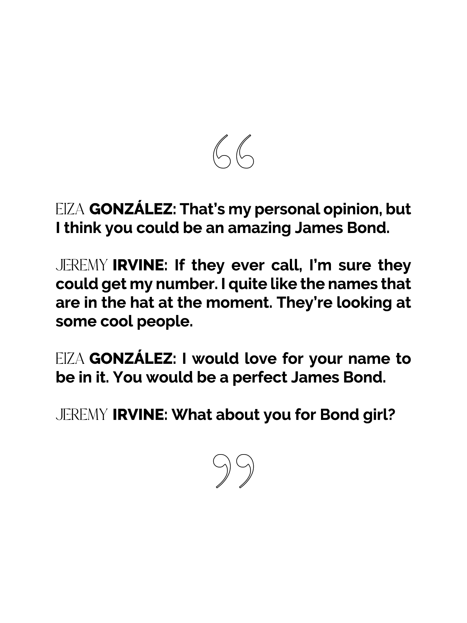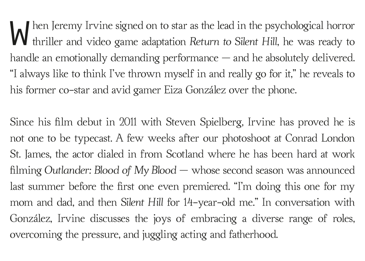 PHOTOGRAPHY: Sylvain Homo TALENT: Jeremy Irvine INTERVIEW: Eiza González VIDEOGRAPHY: Lexy List STYLING: Charlie Schneider-Jacobson GROOMING: Sandra Hahnel at Caren using using 111SKIN pRODUCTION & Polaroids: Jasmine Perrier PHOTOGRAPHY ASSISTANT: Luke Soteriou SOUND DESIGN: LOUISE SPOTURNO LOCATION: Conrad Suite at Conrad London St. James SPECIAL THANKS: Prosper PR & The Lede Company